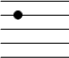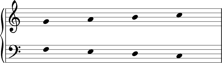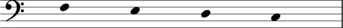 Plaçons, sur la portée de main gauche, un Fa (la quatrième ligne, au cas où tu aurais oublié), et écrivons quelques notes en descendant.